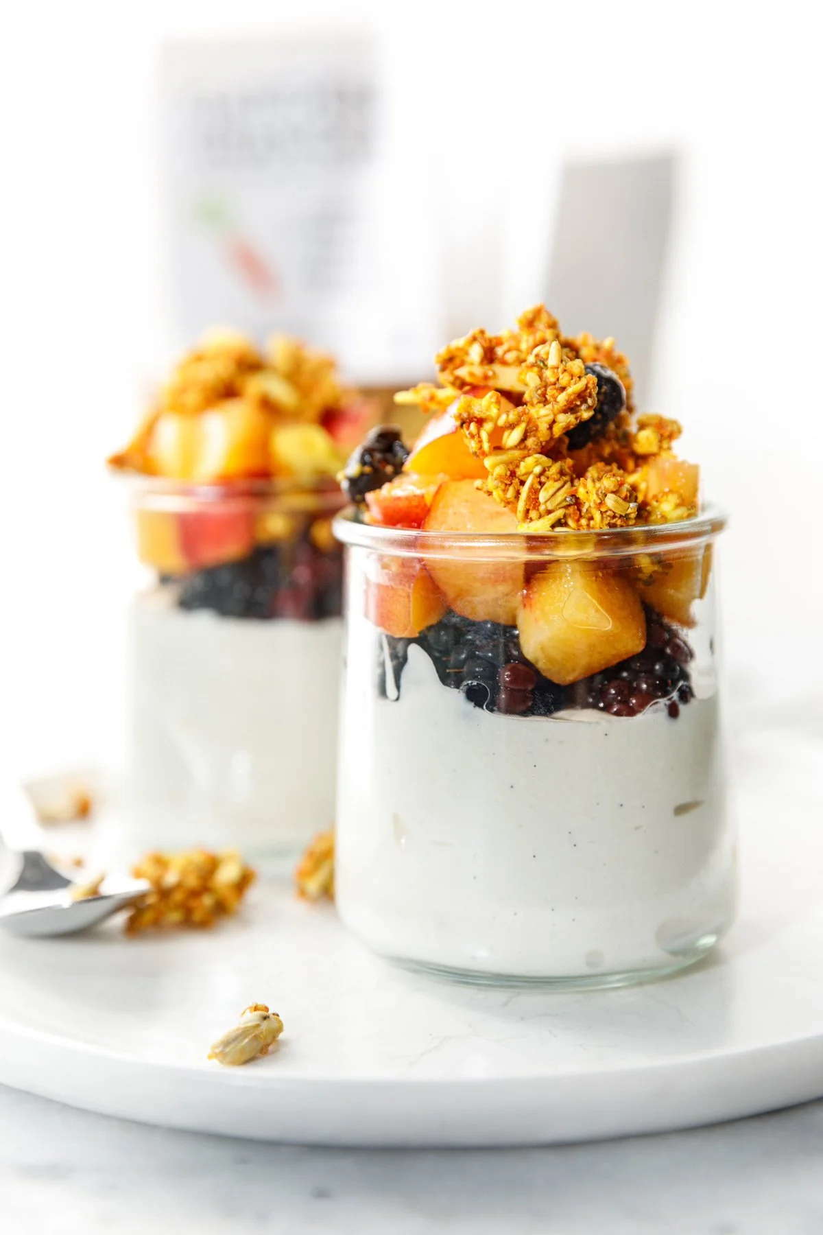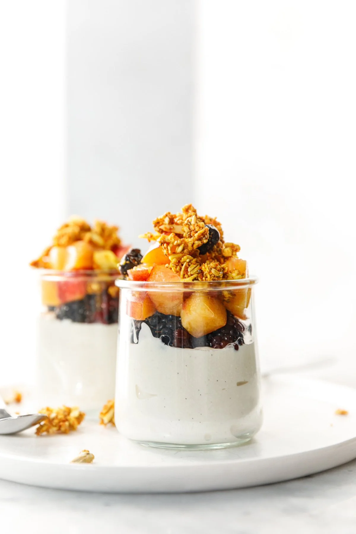 Repeat with remaining yogurt, peaches, blackberries, and finish with a final crown of granola.